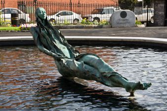Sur cette plaque ont été gravées les huit dernières lignes de Finnegans Wake avec leur traduction en français par Philippe Lavergne (Gallimard, 1982, prix Langlois 1983 de l’Académie française, probable pseudonyme réduit plus loin à ses initiales, P. L.). L’ouvrage semble inachevé puisqu’il se termine par l’article défini the (le, la, l’ ou ce, cet, cette), mais cet article sert, en fait, d’introduction au premier mot du texte, riverrun, enclenchant ainsi un cercle, une re-circulation, tout comme le fleuve retourne à sa source après qu’il a rejoint la mer, s’est évaporé puis est retombé en pluie sur les montagnes qui l’ont vu naître.