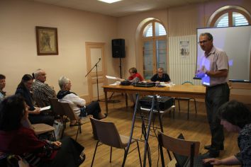 Marion Byrne, membre d'origine irlandaise de l'association, a expliqué, diaporama à l'appui, l'histoire de la famille Joyce. Puis Gérard Colonna d'Istria, aidé de Pierre Présumey, a poursuivi l'exposé entrepris lors des séances de lecture. Le sujet « père-fils » n'est pas aussi simple qu'il y paraît et les échanges furent fructueux.